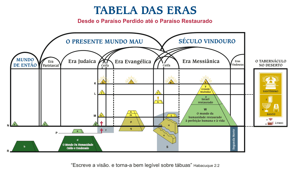 D – Era Patriarcal – (Atos 7:8) E – Era Judaica – (Deuteronômio 7:6; Salmos 147:19, 20) F – Era Evangélica – (Marcos 1:14, 15; Atos 15:14; Mateus 24:14) G – Era Messiânica – (1 Coríntios 15:25; Apocalipse 20:1-6) H – Eras Vindouras – (Efésios 2:7; 3:21) f – Tempo de angústia para Israel na Ceifa Judaica: separação do trigo e palha (Lucas 3:16, 17) S – Tempo de angústia para o mundo na Ceifa Evangélica: separação do trigo e joio (Mateus 13:30, 38-40; Apocalipse 14:15, 18) T – Segunda Morte – Um pouco de tempo, separando ovelhas, bodes (Mateus 25:31, 32; Apocalipse 20:7-10, 14, 15; 1 Coríntios 15:26) K – Estado de glória divina e poder de ofício (Filipenses 2:9-11; Apocalipse 3:21) L – Estado de nascimento do espíritu (João 3:8; 1 João 3:2)M – Estado de geração do espíritu (Romanos 12:1; 1 Pedro 1:3, 4) N – Estado do favor de Deus (para humanos) (Tiago 2:23; Romanos 5:8, 9, 19) P – Estado do favor de Deus (Levítico 16:30; Hebreus 9:7-10)