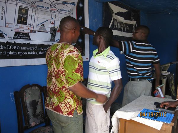 Brothers Edward Nkansah on the left and Samuel Amoo on the right explaining a key point of one of the studies at the seminar to Bro. Paul Arthur during an intermission.